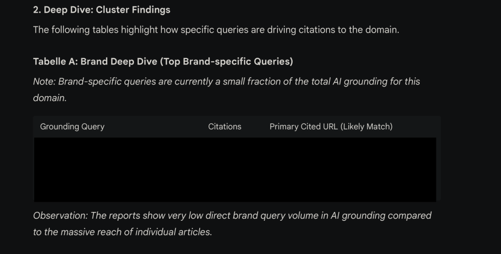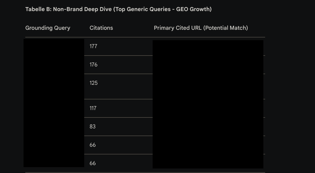 - Requêtes de « Grounding » (Ancrage) : Les expressions que l’IA a générées en interne pour récupérer vos informations. Ce ne sont pas forcément les requêtes tapées par l’utilisateur, mais des reformulations machine pour valider les faits.