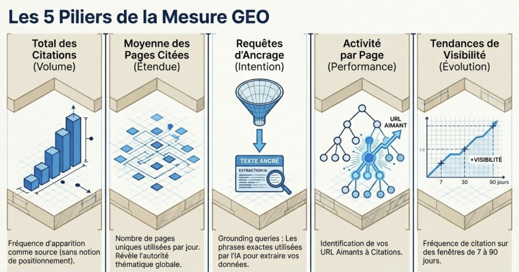 Le dashboard repose sur des indicateurs qui diffèrent radicalement du SEO traditionnel: