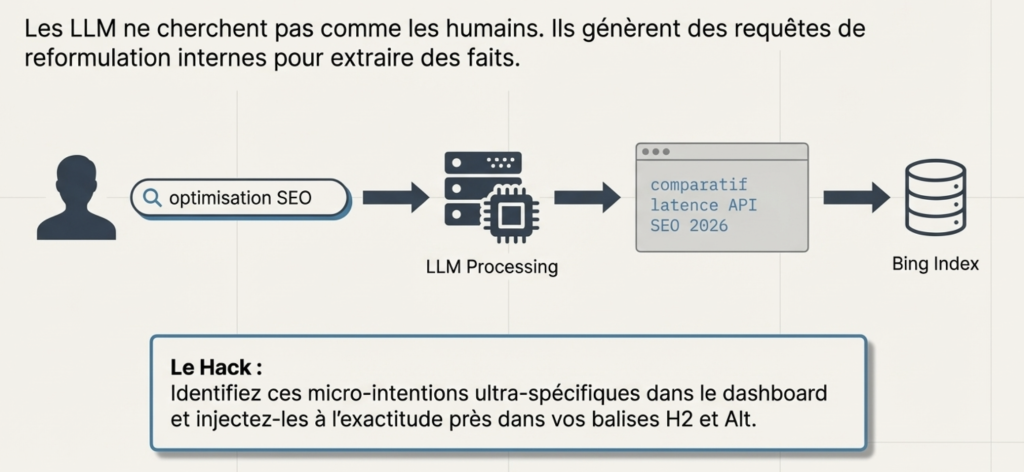 Contrairement aux mots-clés classiques, ce sont les requêtes de « reformulation » que l’IA génère en interne pour aller chercher des faits dans l’index.