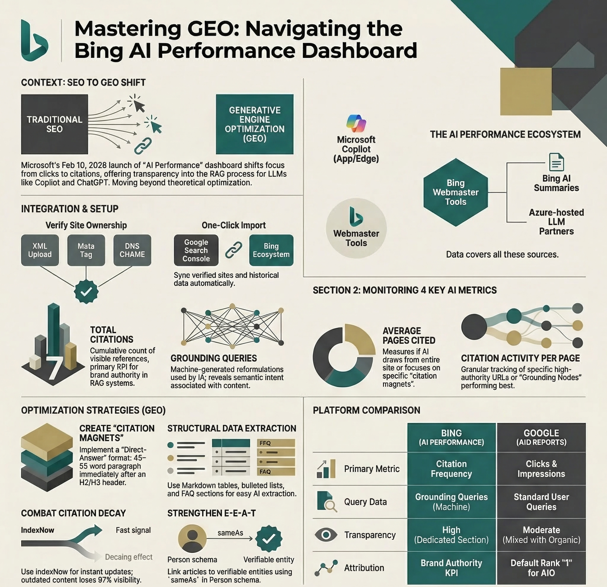 | Metric of Success Primary | Frequency of Citation (Use as the source of truth).[1.3, 1.4] | Clicks and Impressions (Focus kept on the flow of traffic).[2.2, 4.3] |