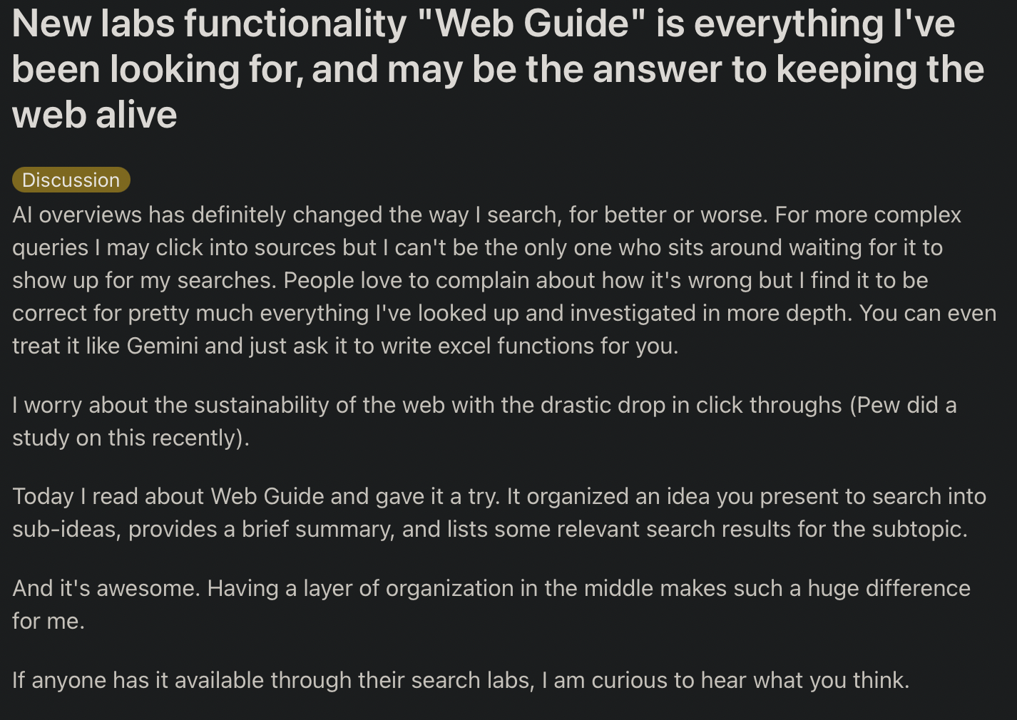 À l’inverse des retours négatifs sur Google AI Overviews, les utilisateurs ayant testé Google Web Guide semblent apprécier l’expérience. Peut-être parce que cette technologie ne se contente pas de résumer le contenu ni de produire des approximations : elle se limite à organiser la SERP, ce qui peut s’avérer réellement utile.