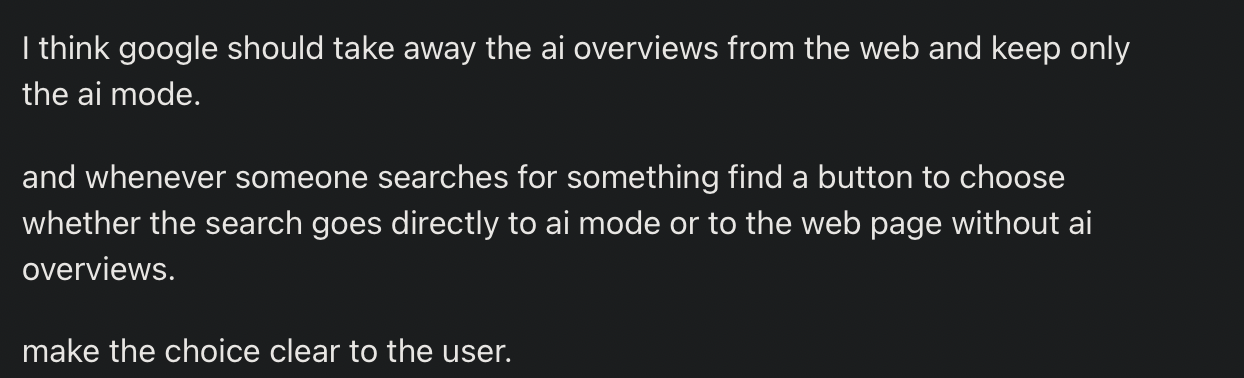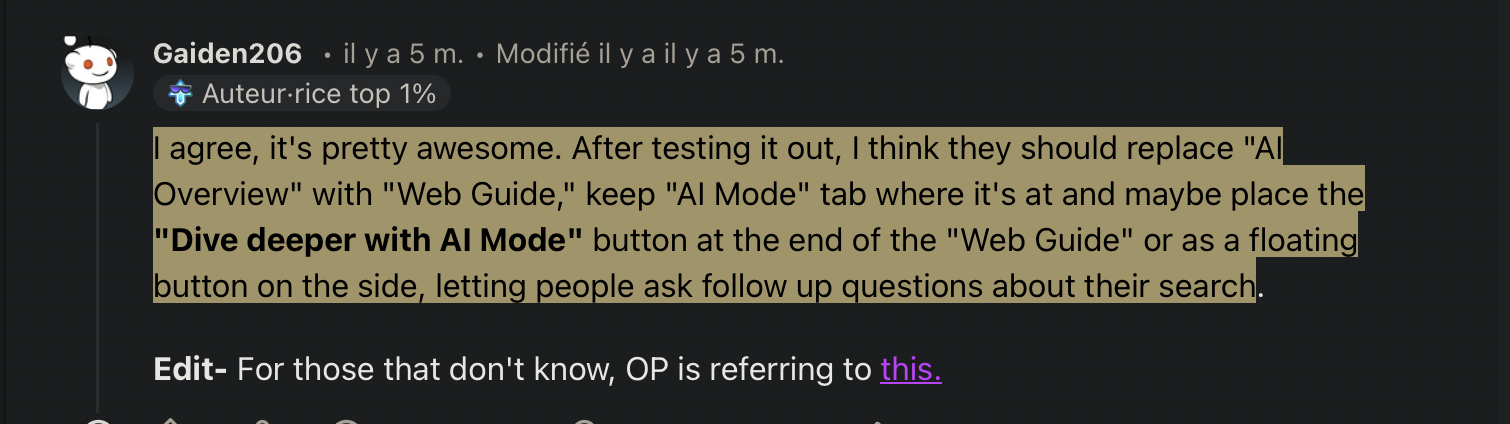 Un autre redditeur, en commentaire du post du premier, va encore plus loin : il suggère de remplacer les AI Overviews par le Web Guide.